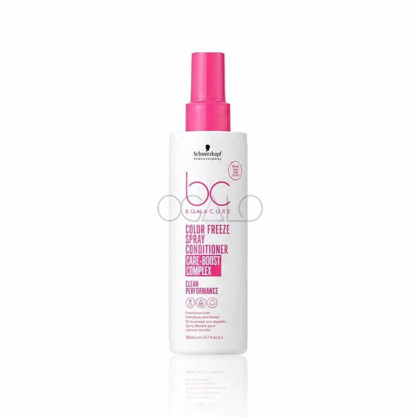 Schwarzkopf BC Color Freeze Conditioner Spray to dwufazowa odżywka do włosów koloryzowanych, którą stosuje się bez spłukiwania. Jej działanie wzmocnione jest substancjami, które pomagają utrzymać świeżość koloru na dłużej. Ponadto nabłyszczają pasma i nawilżają je. Dodatkowo sprwiają, że uszkodzone włókna włosów zostają zrekonstruowane. Postać sprayu powoduje, że Schwarzkopf BC Color Freeze Conditioner Spray nie obciąża włosów, a zawarty w niej filtr UV chroni je przed szkodliwym działaniem słońca. Odżywka znacznie ułatwia rozczesywanie włosów.
